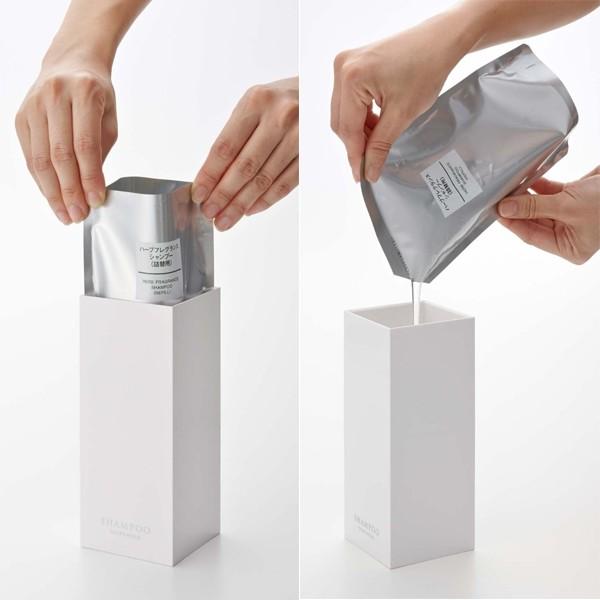 一般的なディスペンサーと同様、ボディソープなどの液体をダイレクトに入れられますが、蓋が外れる仕様なので、中身を出さずに詰め替え用パックのまま、入れることもできます。