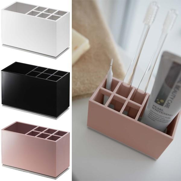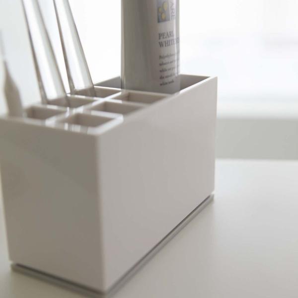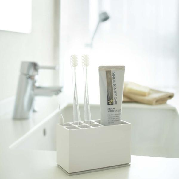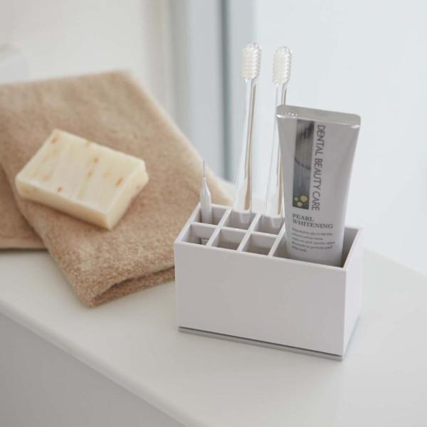 洗面室をスタイリッシュに演出する歯ブラシスタンドです。歯ブラシ・歯間ブラシ・歯みがきチューブをまとめて収納できます。