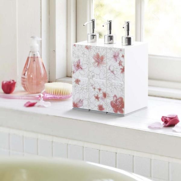 シャンプー、コンディショナー、ボディーソープの順でまとめて並べると、花柄が繋がる!可憐でかわいいディスペンサーボトル!