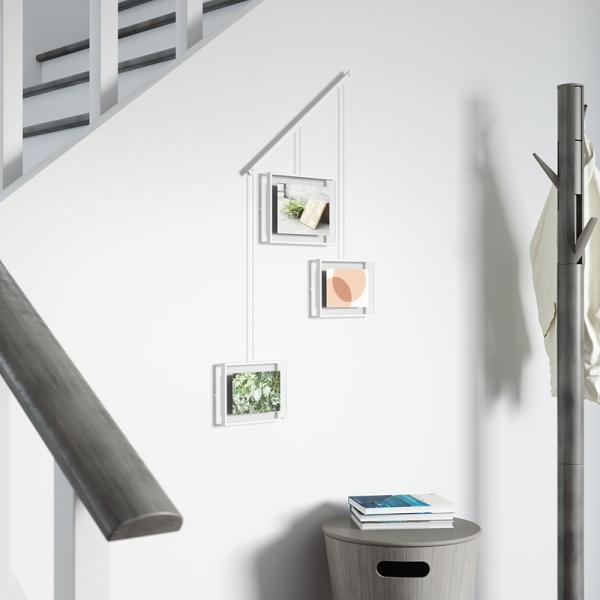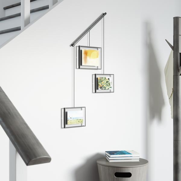 ・レールは水平に掛けるだけでなく、斜めに掛けることもできるので、階段横の壁などにもディスプレイできます。