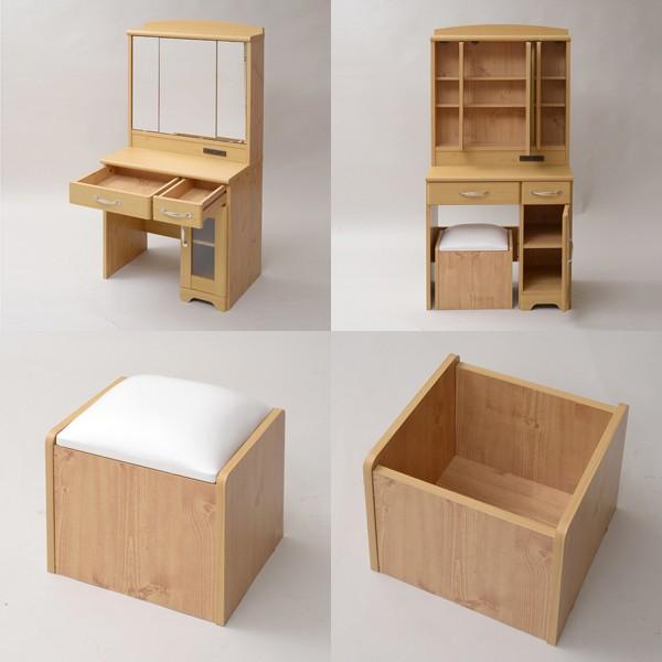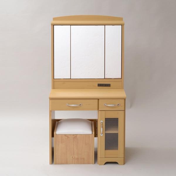 スタンダードなカラーでシンプルな三面鏡ドレッサー。スツールは座面の中に収納可能なスペース付。