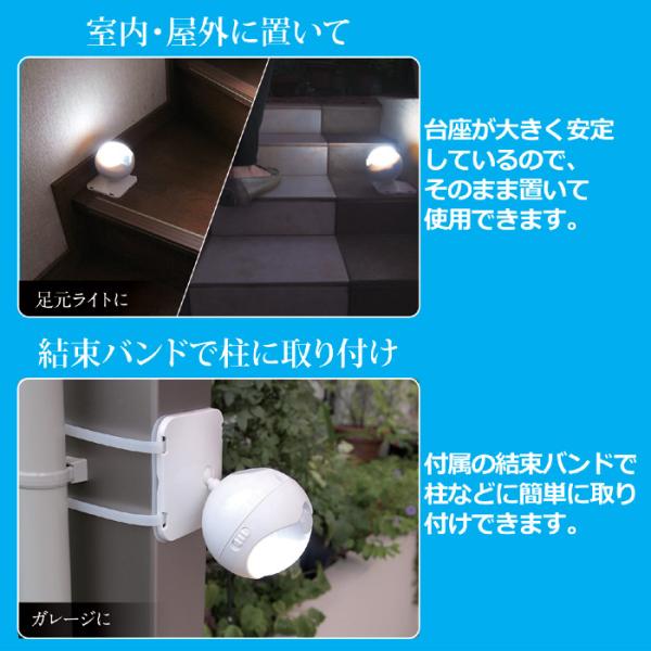 このセンサーライトは、暗くなった時に人が近づくと感知してライトが点灯、明るく照らしてくれます。付属パーツが充実していて、置いて使用はもちろん、壁に掛けたり、柱に巻きつけたり、引っ掛けたりも可能。