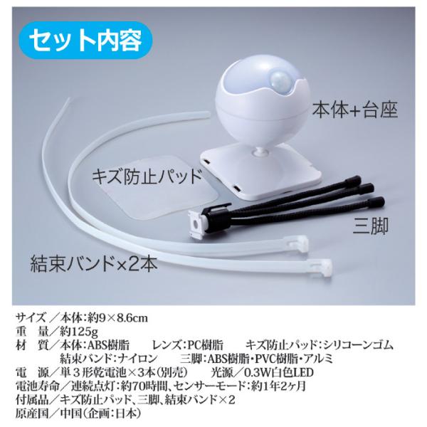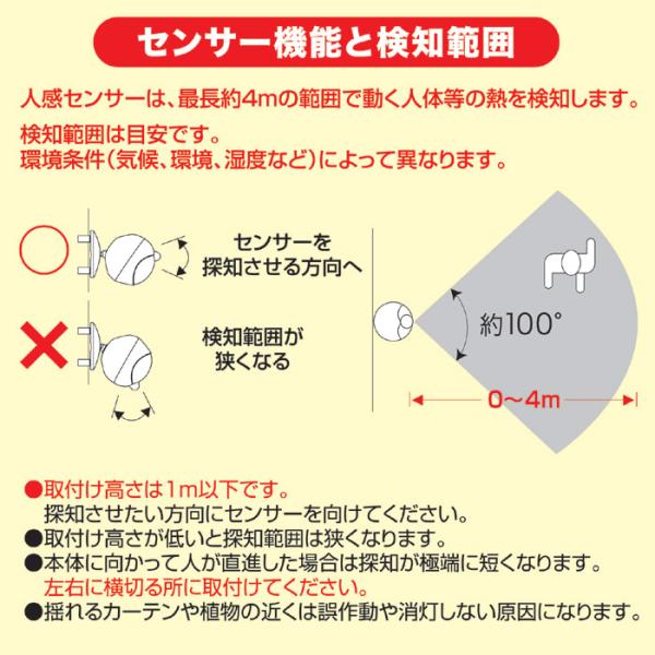 センサー感知範囲は最長約4メートルで、点灯後は約20秒後に消える消し忘れ防止機能付き。スイッチの切り替えで、センサーモード(AUTO)、常時点灯(ON)、消灯(OFF)が可能です。