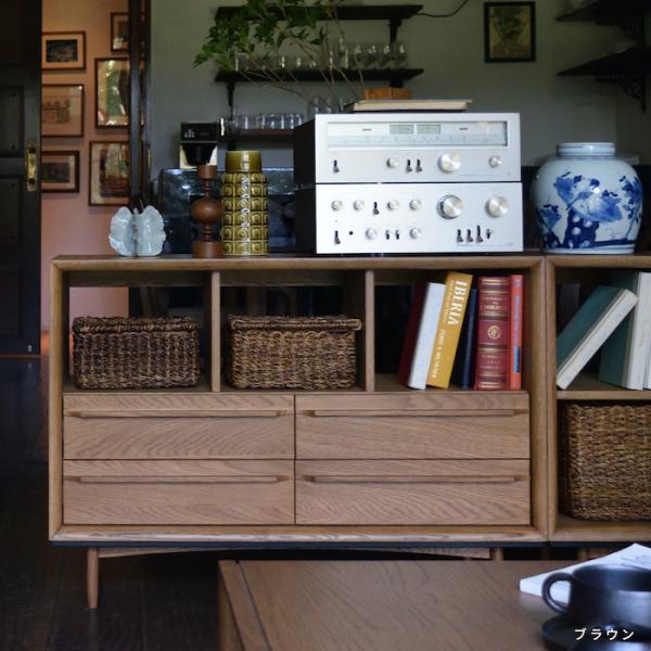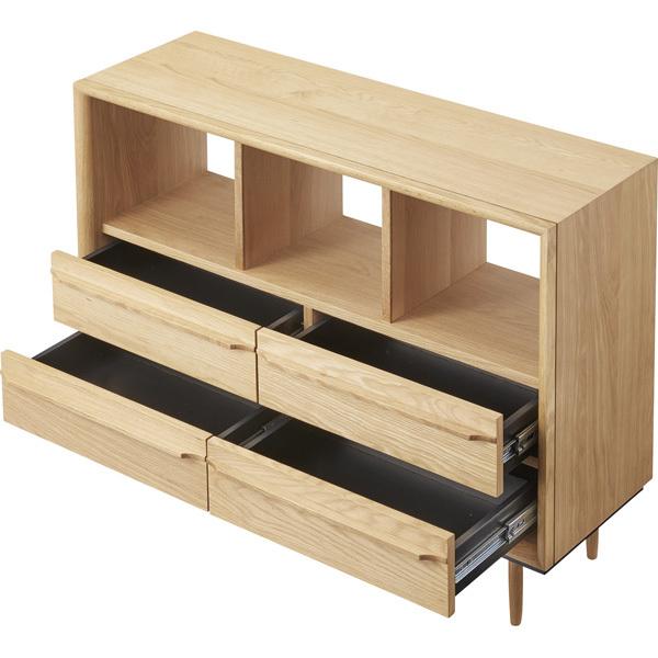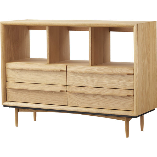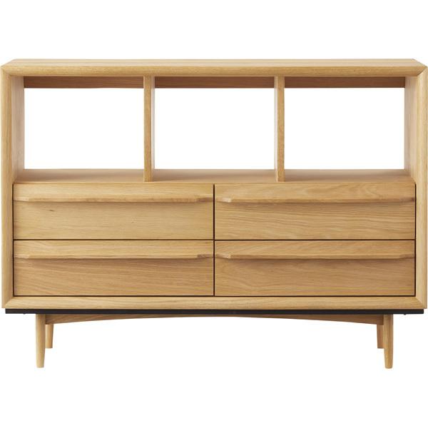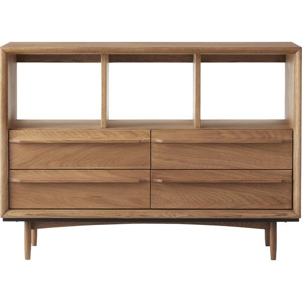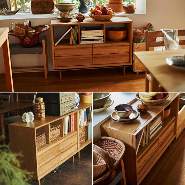 お気に入りの小物を飾ったり文庫本などを置くことができるオープン棚と、スライドレール付きで奥の物も取り出しやすい4杯の引き出しで、見せたい物も隠したい物もすっきりと収納できます。