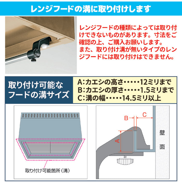 レンジフードの溝に挟み込んで取り付けるのでカンタンです。