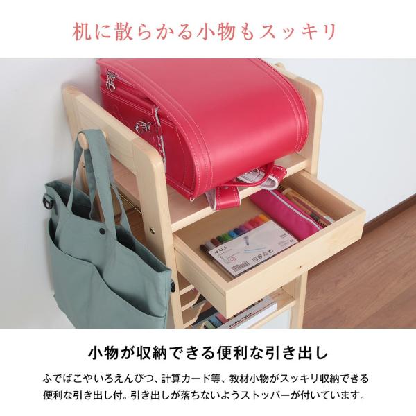 筆箱や色鉛筆、計算カード等、教材小物がスッキリ収納できる便利な引き出し付き。