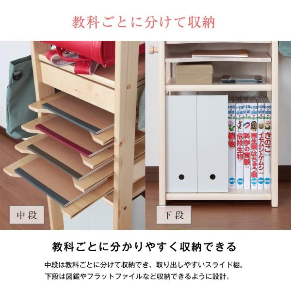 中段は教科ごとに分けて収納でき、取り出しやすいスライド棚。