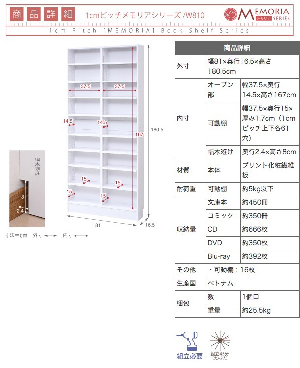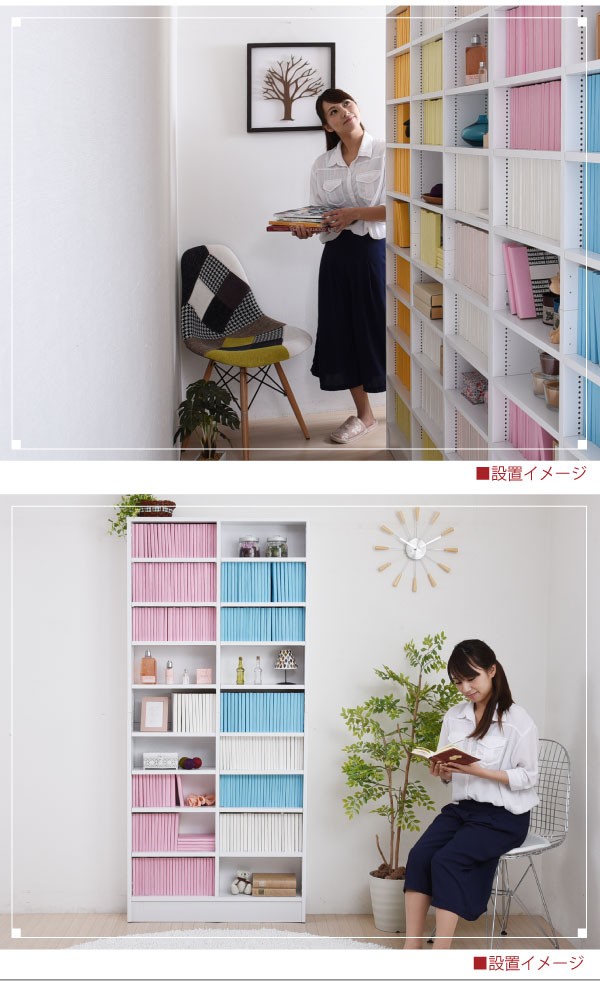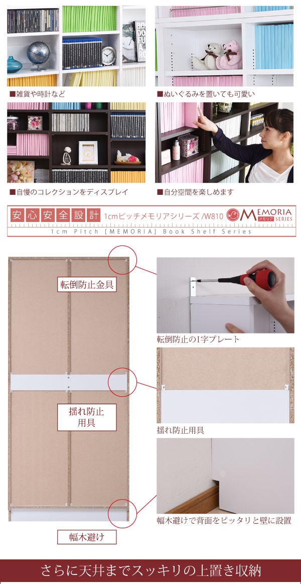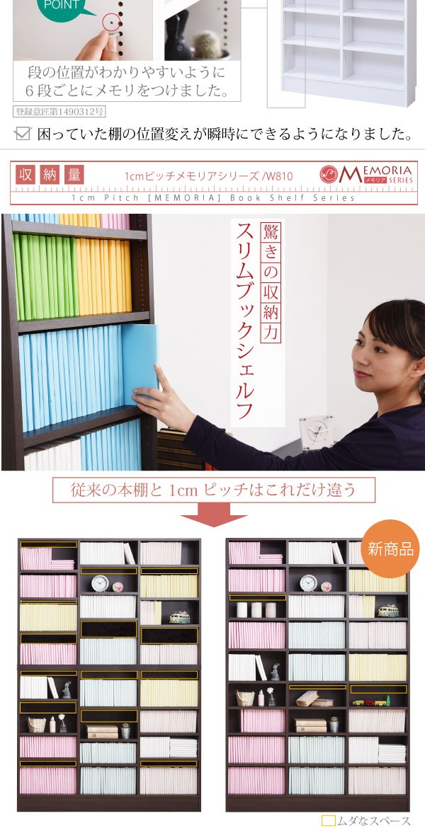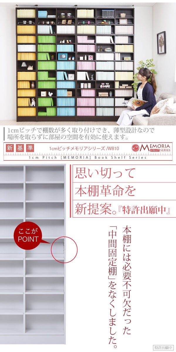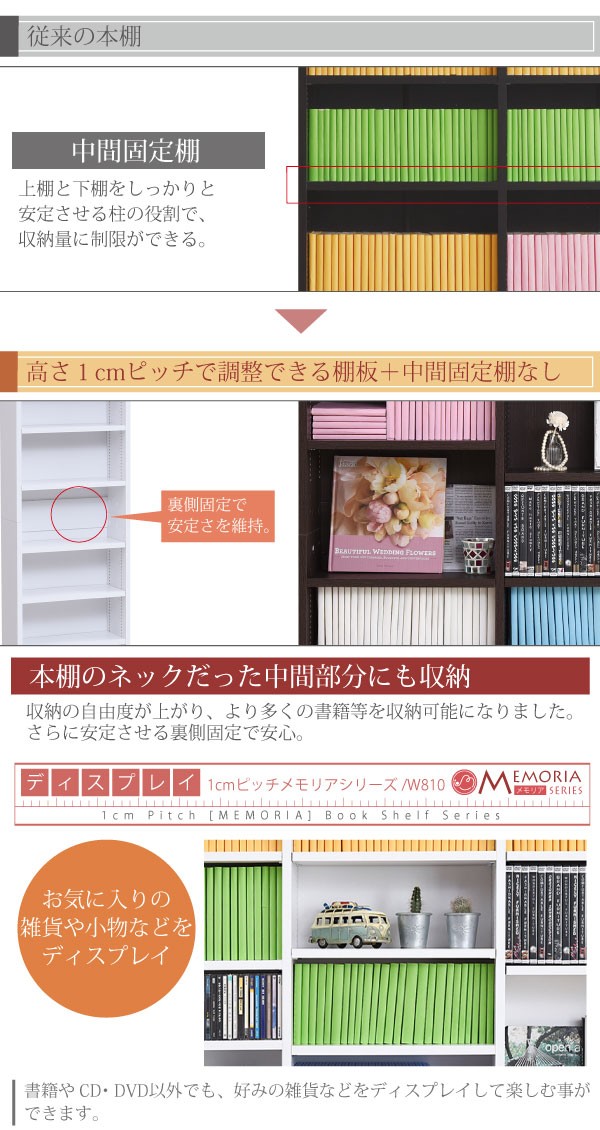 1cmピッチで可動棚を設置できるから、無駄なく収納できる本棚です。