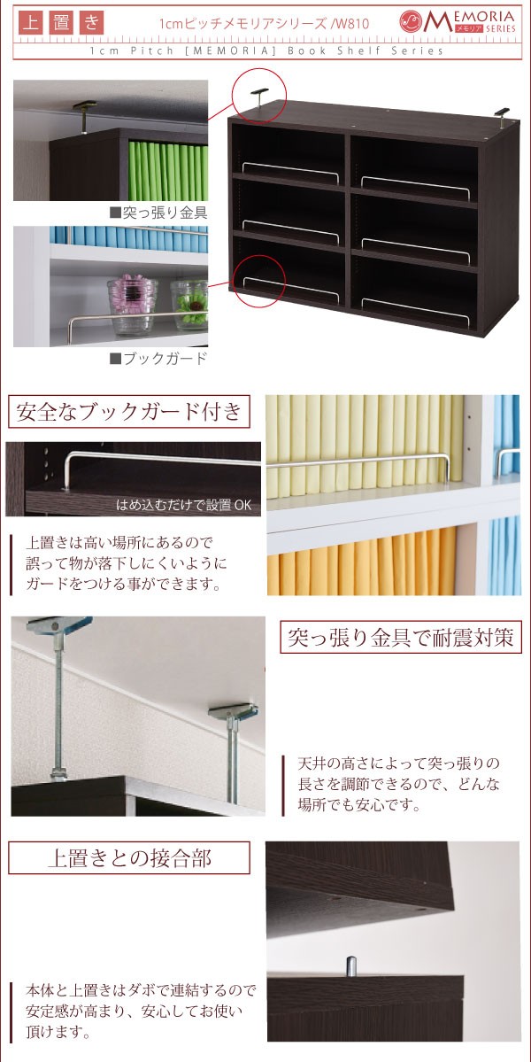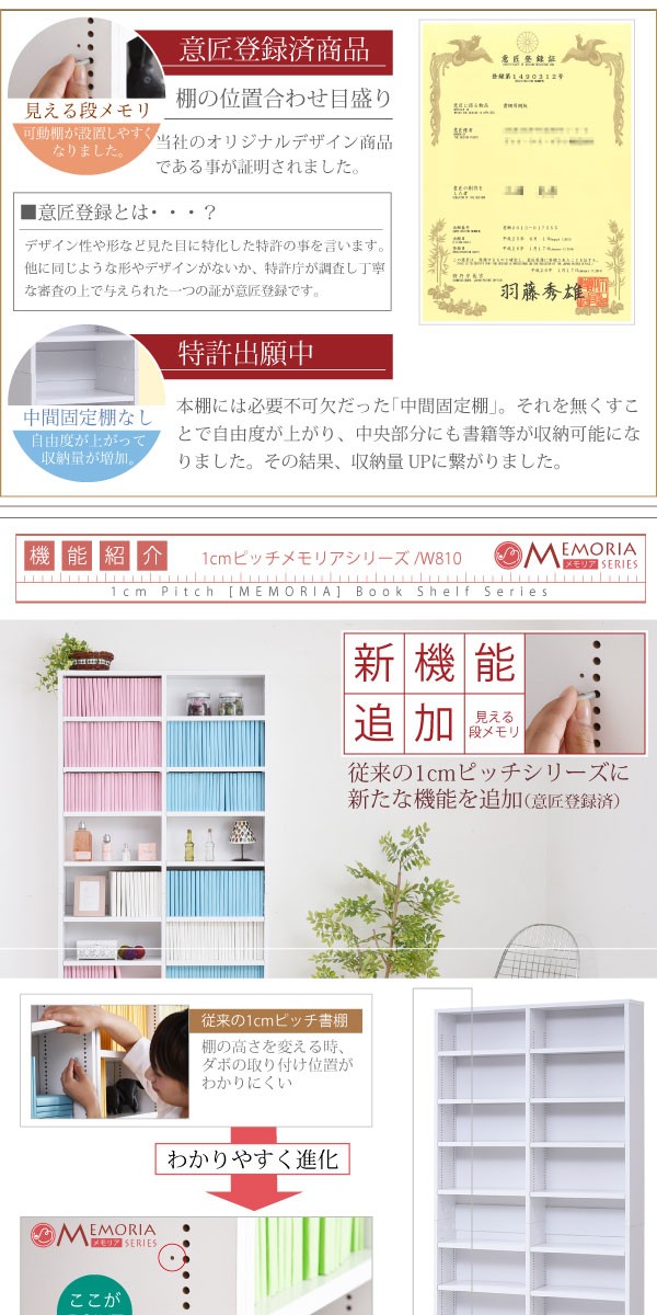 1cm間隔で棚板が設置でき、固定棚の無い画期的な仕様により、従来よりも自在な棚割りを可能にしました。