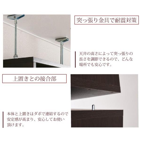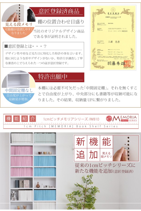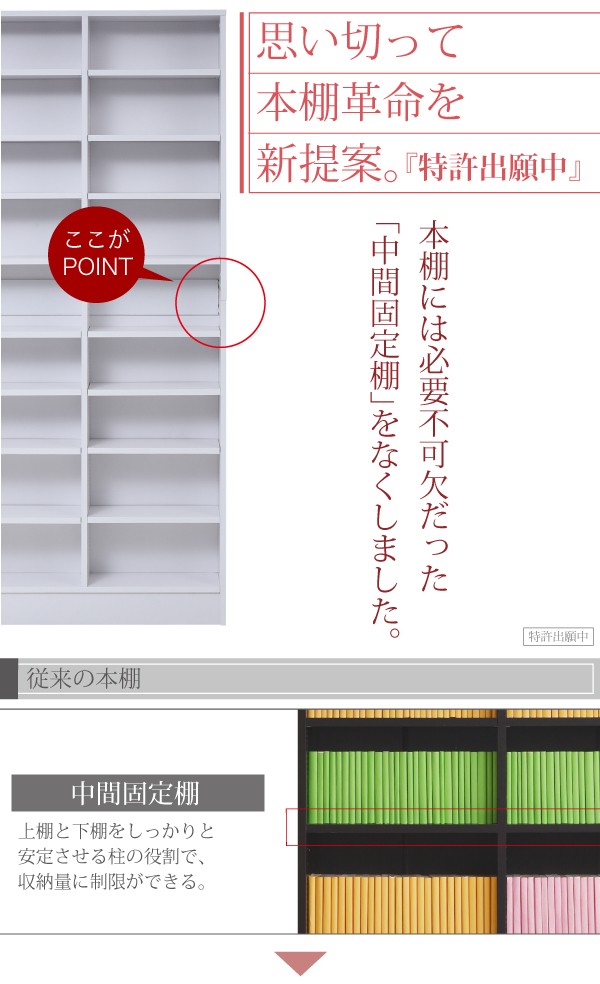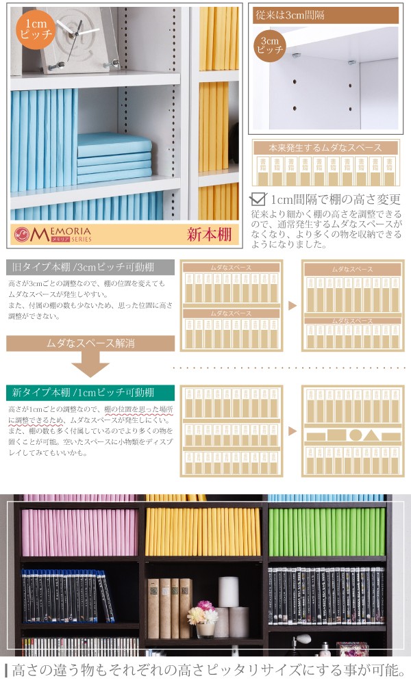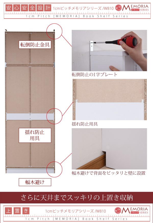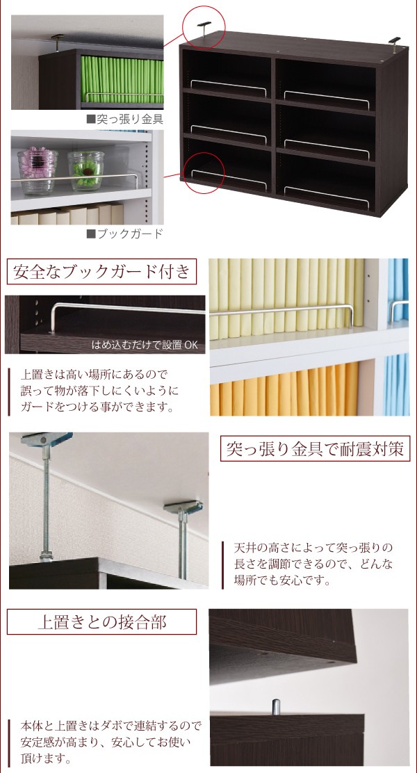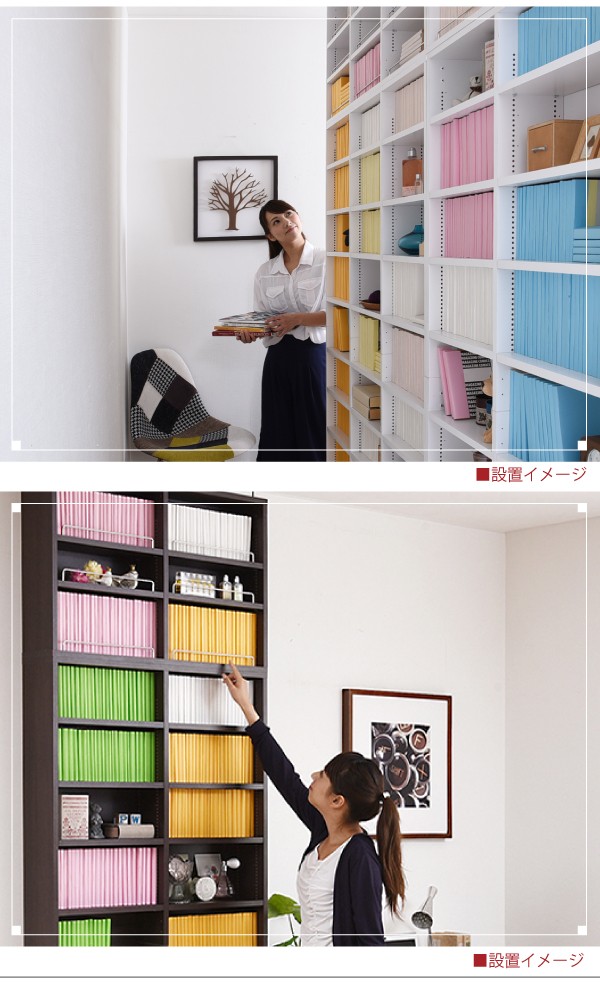 突っ張り上置きセットなので天井まで空間の無駄を省いて大量収納。1cm間隔で棚板が設置でき、固定棚の無い画期的な仕様により、従来よりも自在な棚割りを可能にしました。