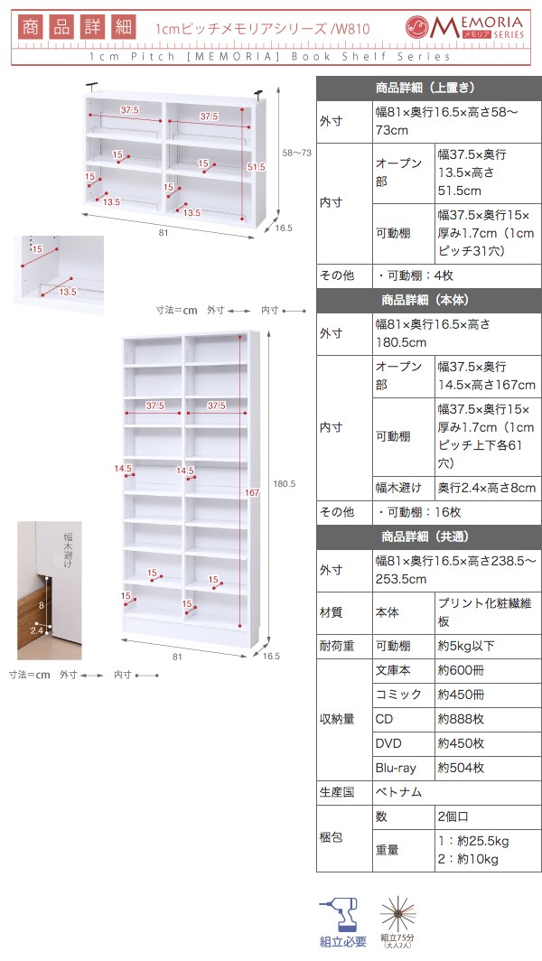 外寸:幅81.0×奥行16.5×高さ238.5~253.5cm