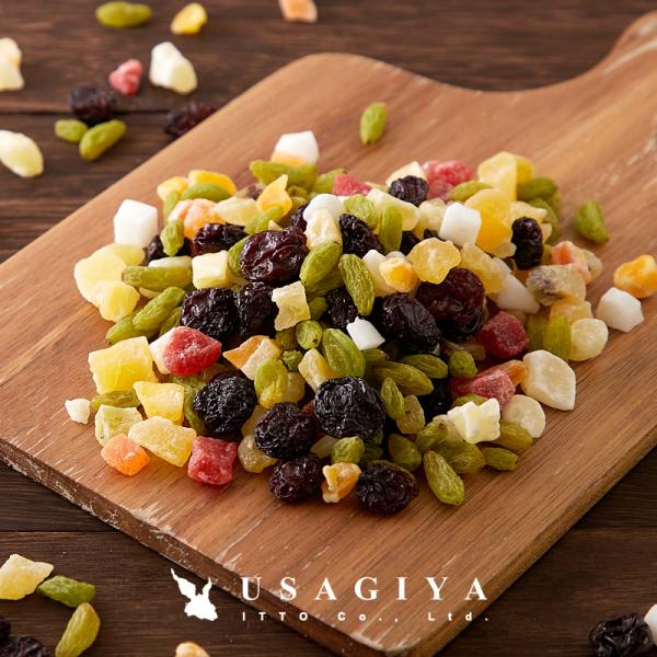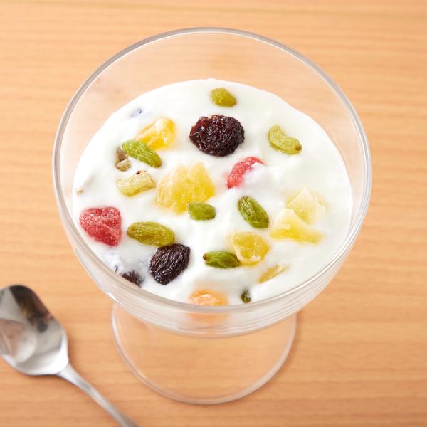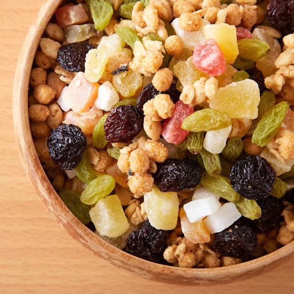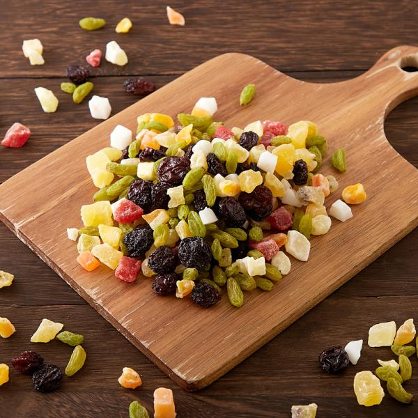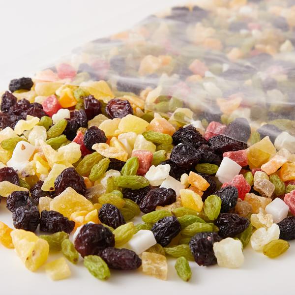 乾燥果実(マンゴー(タイ)、キウイフルーツ(中国)、リンゴ(中国)、イチゴ(中国)、パパイヤ(タイ)、パイン(タイ)、ココナッツ(タイ)、レーズン(チリ)、緑レーズン(中国)、砂糖、植物油/香料、クエン酸、着色料(赤40)、酸化防止剤(亜硫酸塩)
