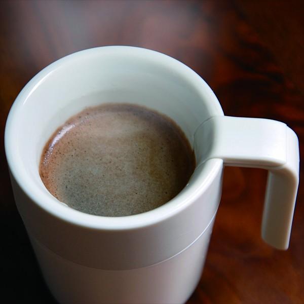 カップは二重構造で、熱い飲み物が入ってもしっかりと持て保温性も高いカフェプレスマグです。