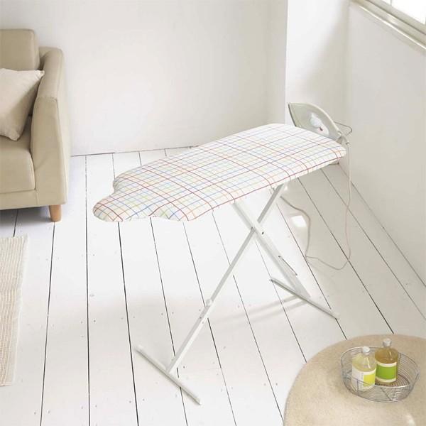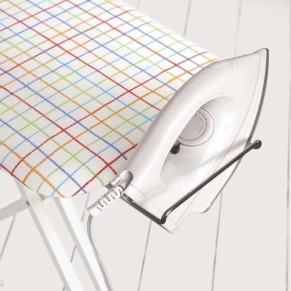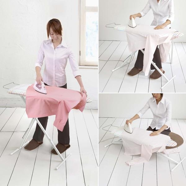 立ってラクな姿勢で掛けられるスタンド式アイロン台。膝への負担を少なくします。