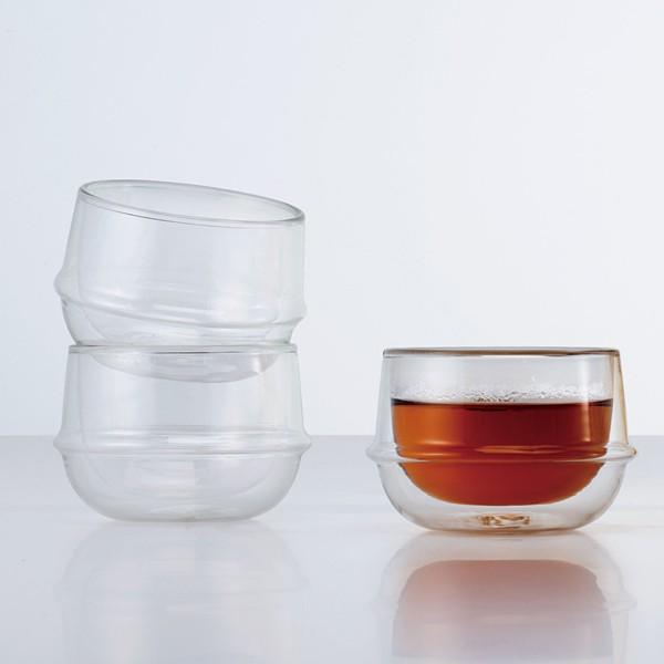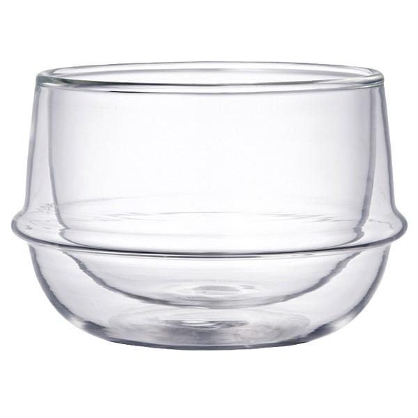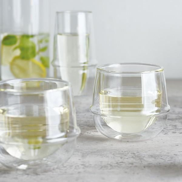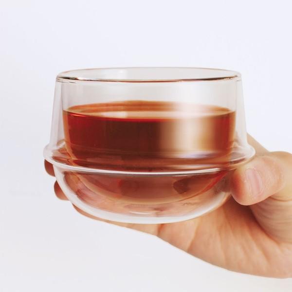 二重構造の耐熱ガラス製なので、ホットドリンクを注いでも表面が熱くなる心配がありません。また、冷たいものを入れても表面に水滴がつきにくく、テーブルを濡らすことがありません。
