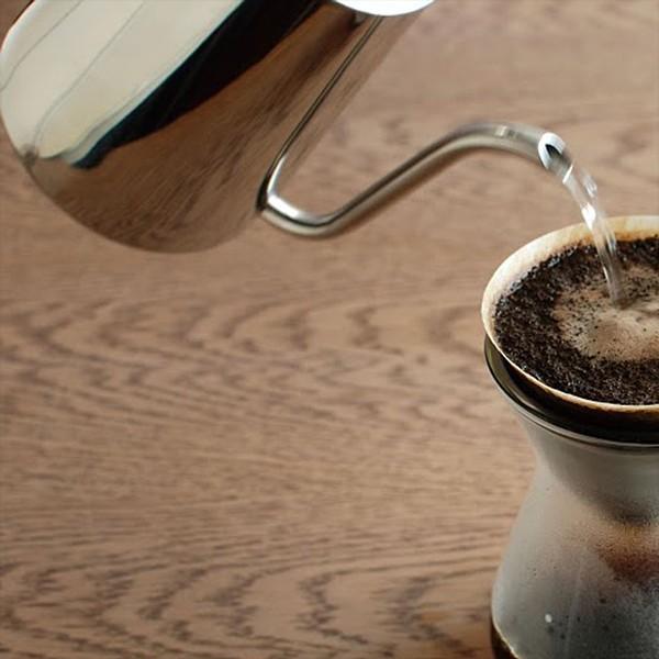 ケトルは細い注ぎ口で、お湯を注ぐ位置や量、スピードを調整でき、フタは注ぐときに傾けても外れない構造になっています。