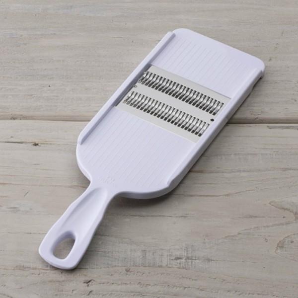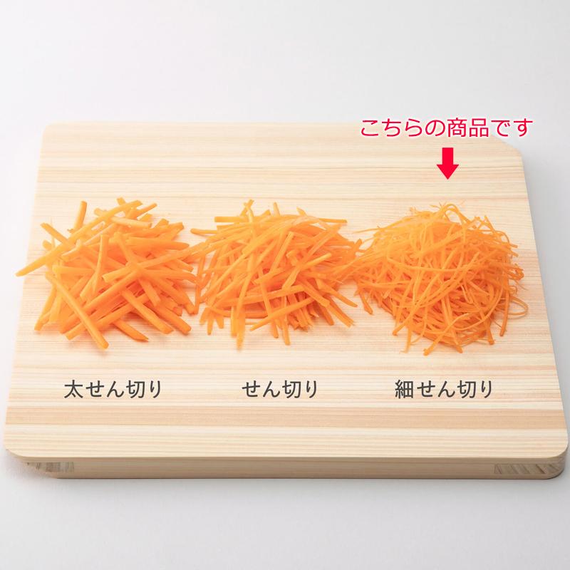 トンネル状のクランク刃を通すことで包丁で刻んだような、角のある美しい細千切りが簡単に仕上がる「細せん切り器」です。