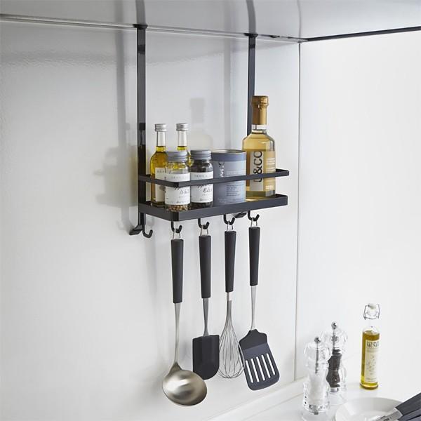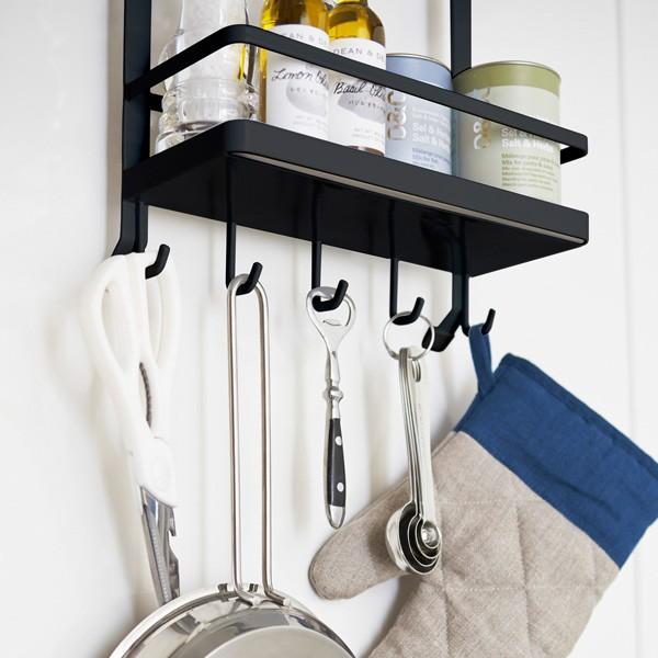 換気扇下が、スパイスや調味料・調理道具の収納スペースに早変わり!お玉やフライ返しなどの、調理器具を収納できるフックにはフライパンも掛けられます。