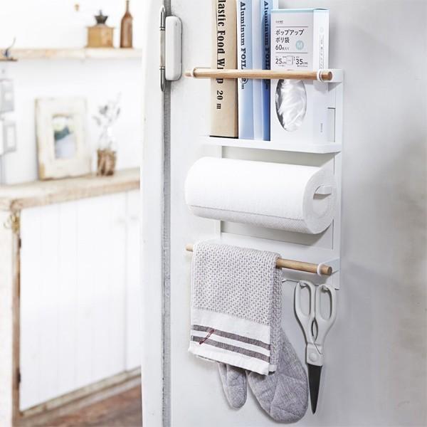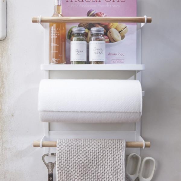 冷蔵庫の側面にマグネットで取り付けるだけの簡単取り付け。よく使うキッチン小物を一括収納できます。