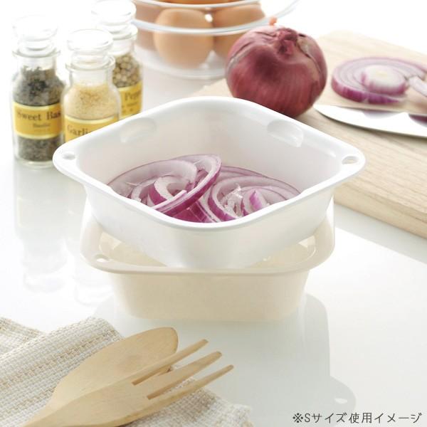 フックにかけて保管できる穴付き。穴に合わせて水切り時のズレを防止する突起付きです。