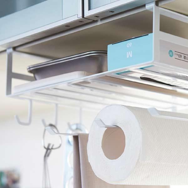 よく使うキッチンペーパー、布巾、調理道具、ラップ類なども一括収納!