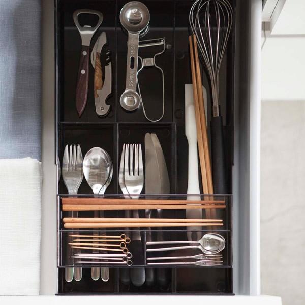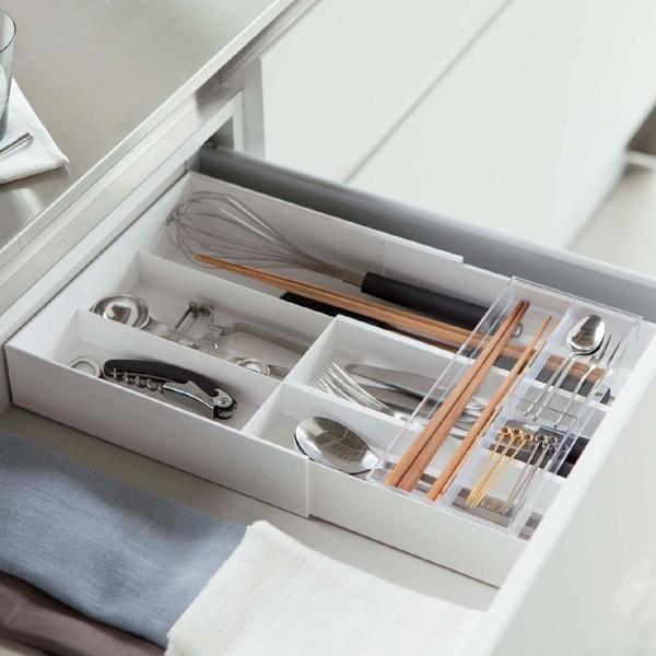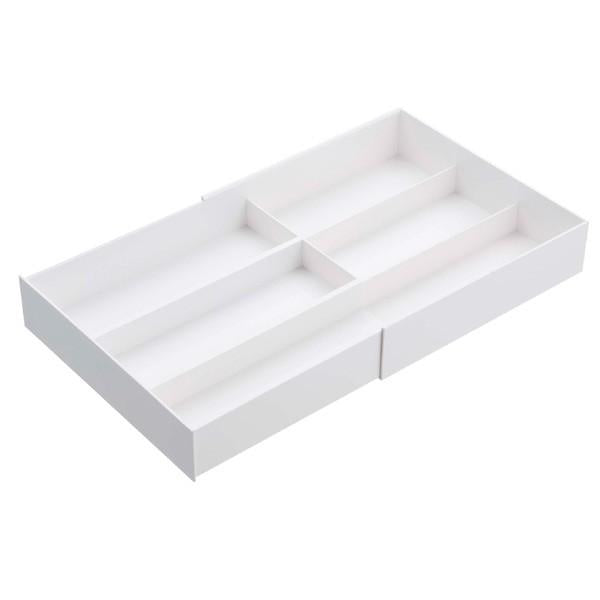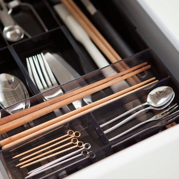 トレーの奥行きが伸縮するので、お使いの引き出しにあわせたぴったりサイズでお使いいただけるスライド式カトラリートレーです。