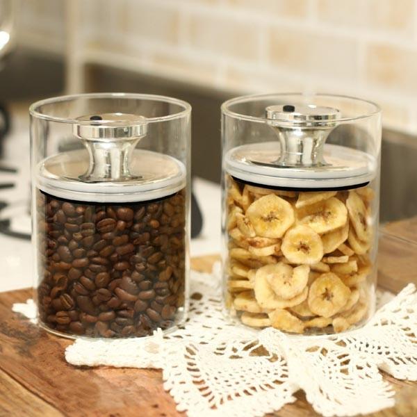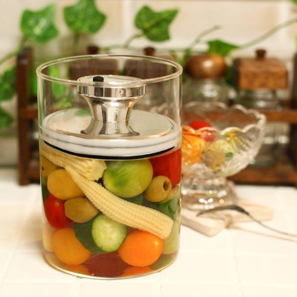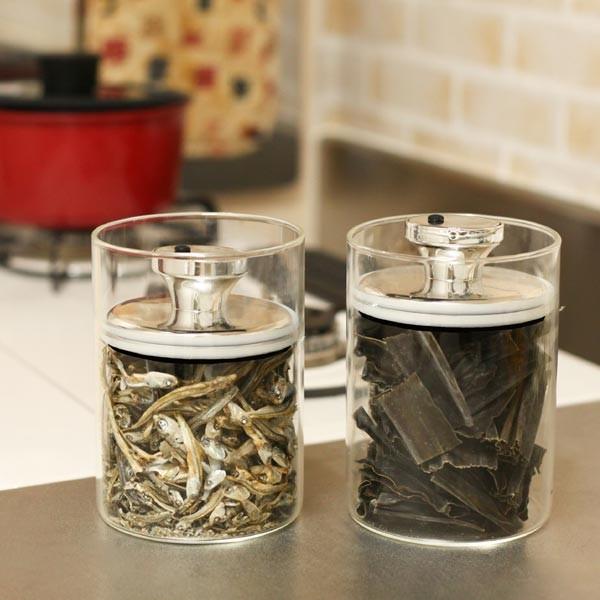 余分な空気を減らして食品の酸化を防止し長期保存できるガラス容器です。
