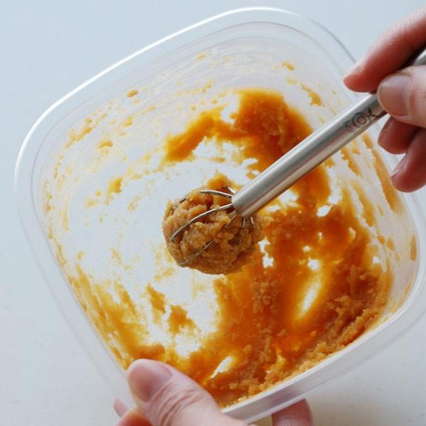 大小の丸い計量部を味噌に差してくるりと回すと簡単に味噌の計量ができます。