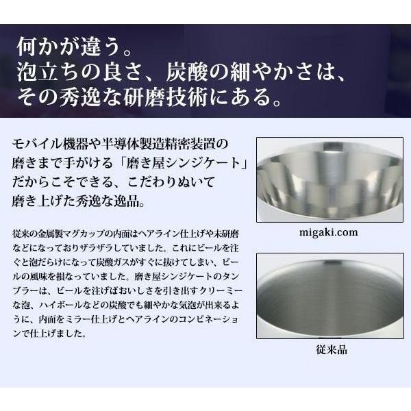 ビールを注げば美味しさを引き出すクリーミーな泡、ハイボールなどの炭酸でも細やかな気泡ができるように、内面がミラー仕上げとヘアラインのコンビネーションで仕上がっています。