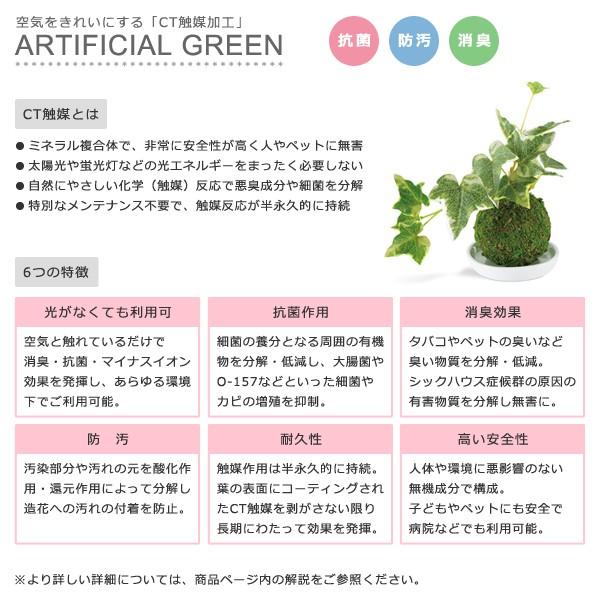 ●観賞用に精巧に作られた造花やフェイクグリーンを使用し、日本国内でCT触媒のコーティング加工を施しています。フェイクグリーンの葉や花びらに付着した悪臭成分や空気中の細菌をCT触媒の働きによって分解するという仕組みで、お部屋の空気浄化を行います。