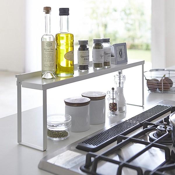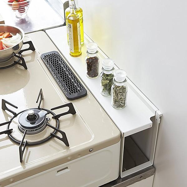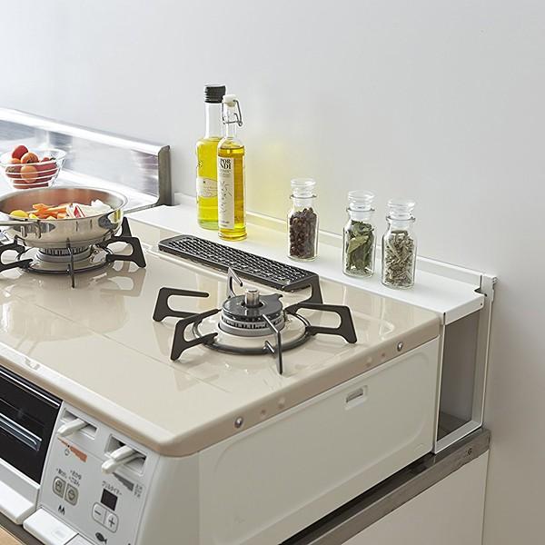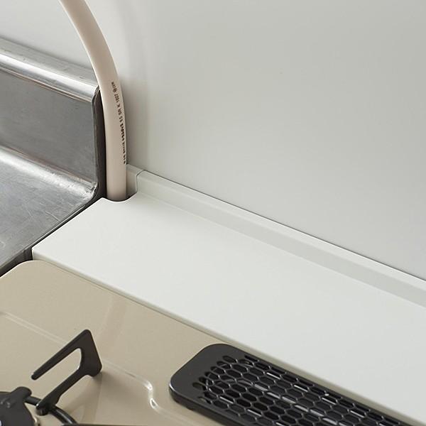 ガスコンロ奥の隙間に落ちるゴミや油汚れをガードするだけでなく、調理道具やスパイスの一時置きにも便利です。