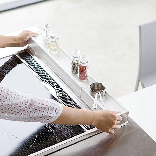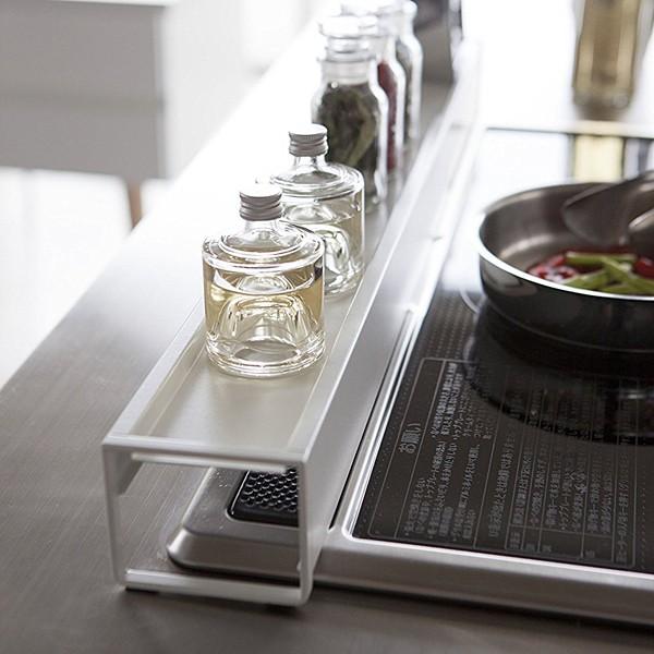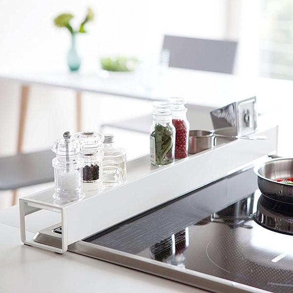 スパイスや調味料などが置けるガード付きの棚で排気口の上を有効活用!