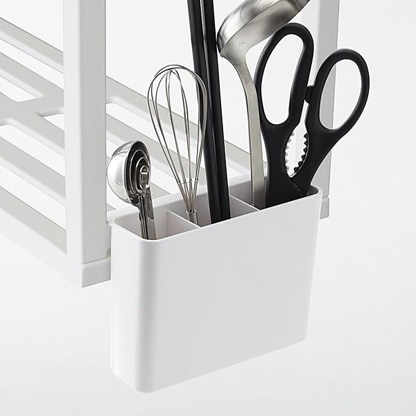 カトラリーポケット&調理道具などを掛けられるフック付き。